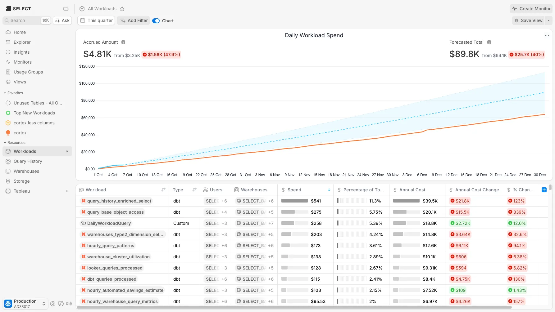 Following our update to charting components a few weeks ago, we’re now launching the ability to easily produce machine learning powered spend forecasts on all charts in SELECT! You can compare this forecast with the previous period, as seen here in orange.