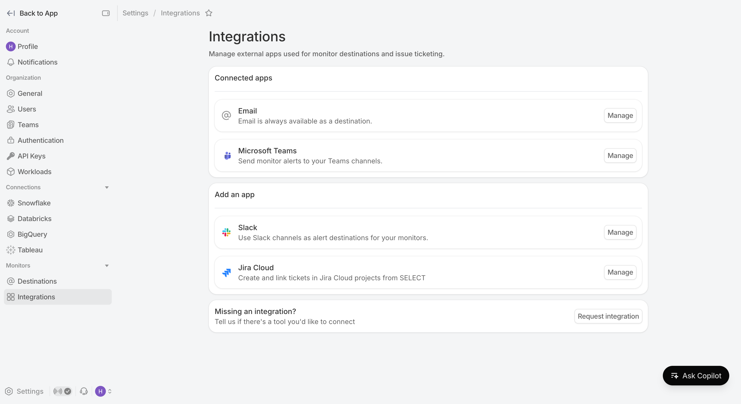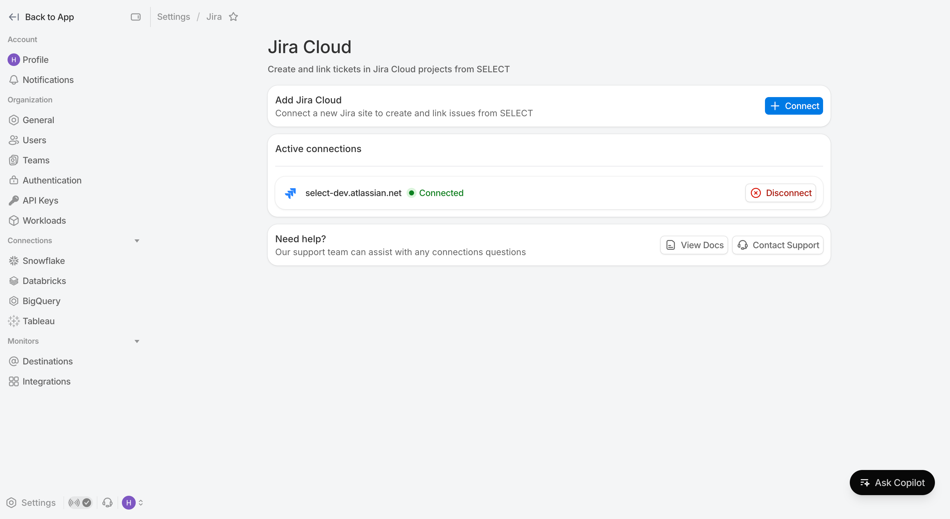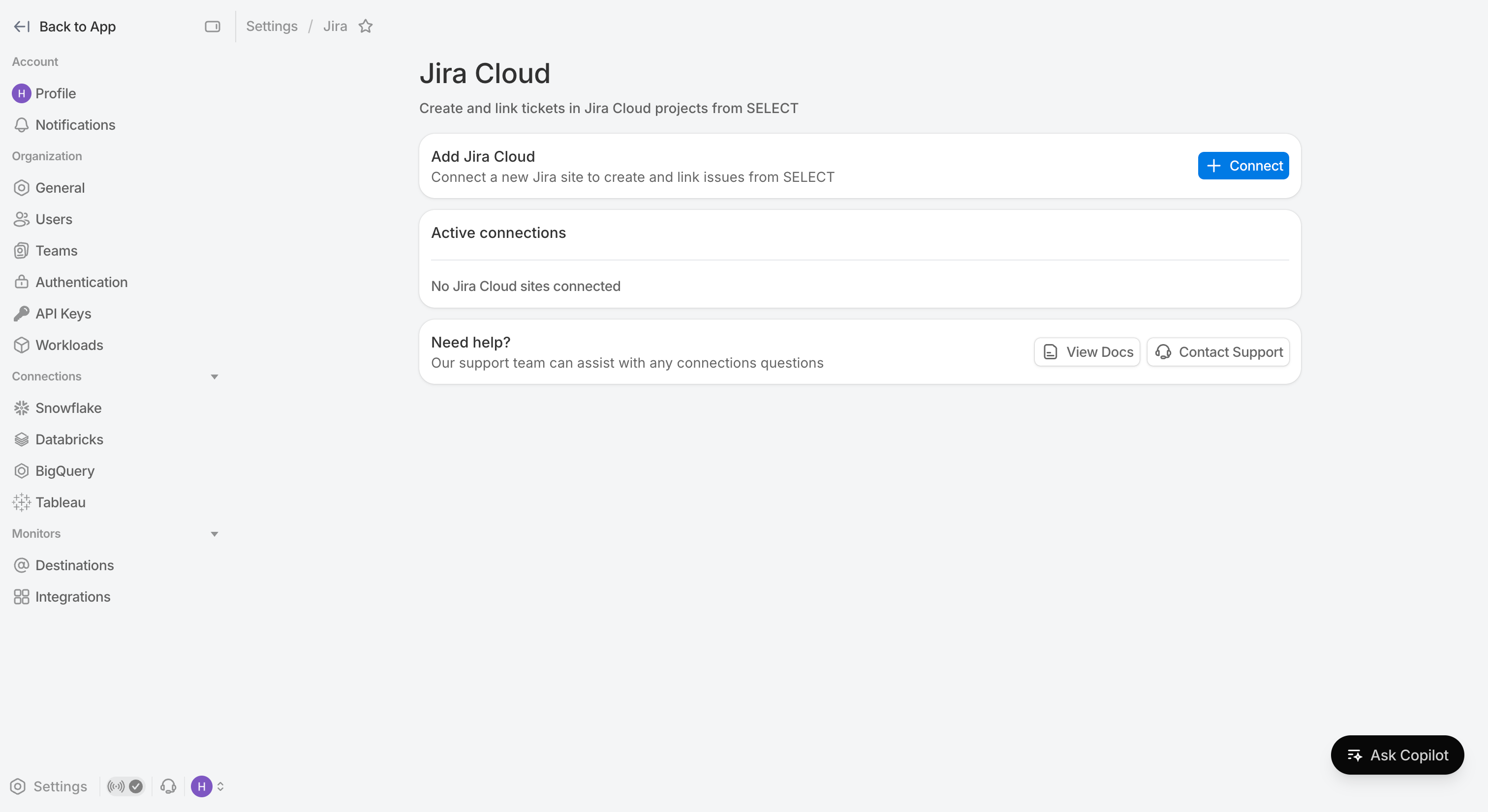 Navigate over to Settings → Integrations . Here is where you can link external applications to SELECT. Click on Jira Cloud to manage the list of active connections.