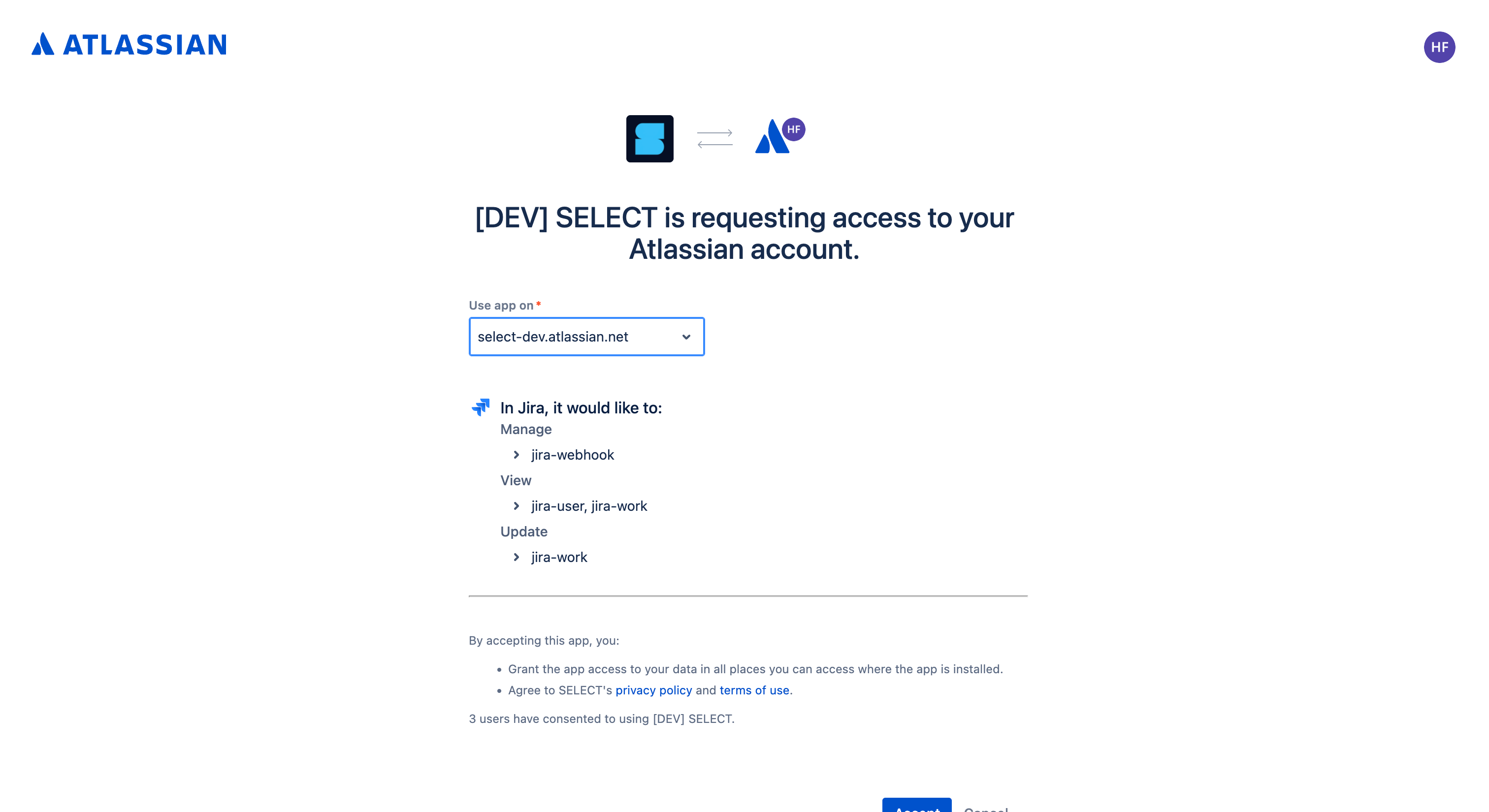 Clicking on connect will navigate you to Jira where you can select which Jira Site to connect with. Once successful, you will be navigated back to SELECT with a new active connection.