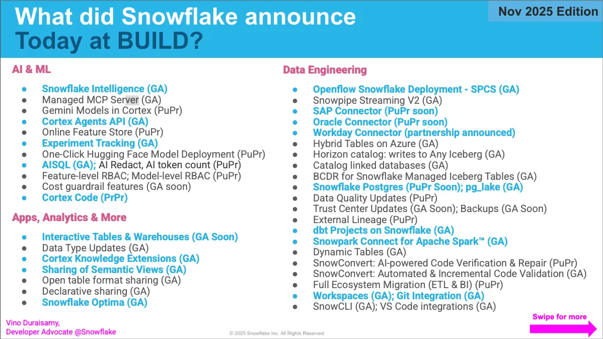 This article covers the highlights from Snowflake Build 2025. I want to thank Vino Duraisamy for publishing this great summary slide on LinkedIn which hits on a few more announcements.